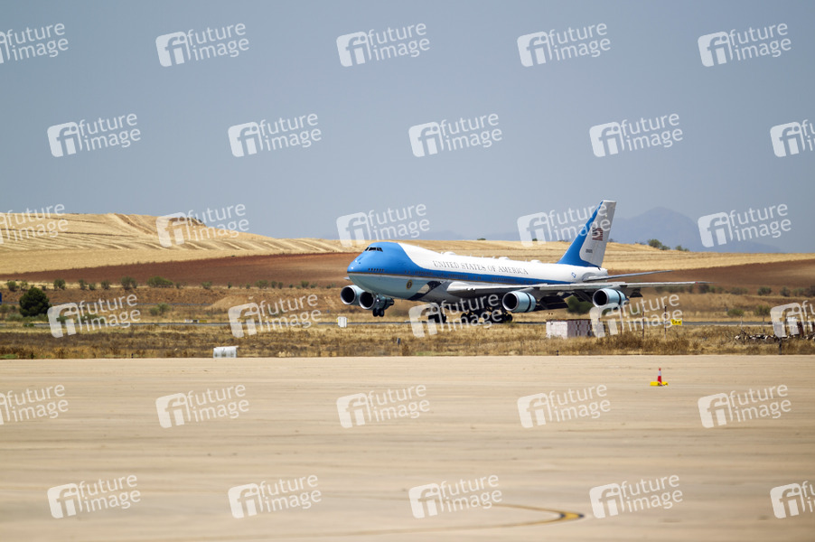 Ankunft, Glughafen, Airport, Militärflughafen, Base Aérea de Torrejón de Ardoz, Gipfeltreffen der NATO-Staaten, NATO-Gipel, Verteidigungsbündnis, Flugzeug, Boeing 747-200B, Präsident der Vereinigten Staaten, Demokratische Partei