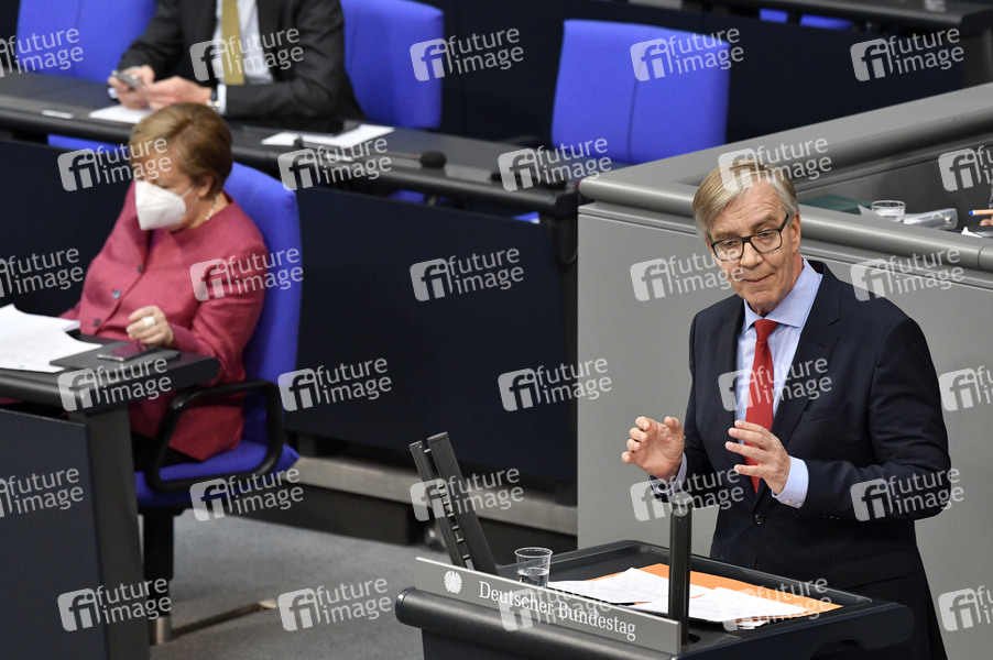 Angela Merkel und Dietmar Bartsch in der 222. Sitzung des Deutschen Bundestages im Reichstagsgebäude. Berlin, 16.04.2021