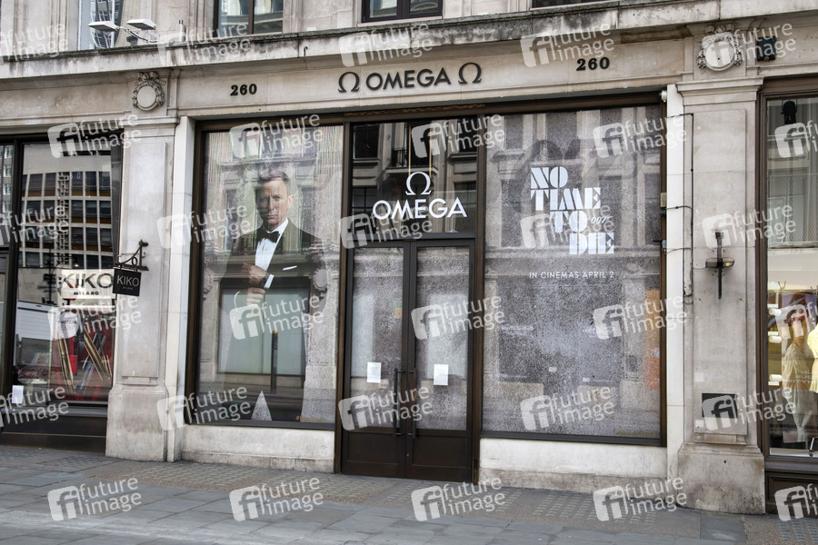 Omega Uhren-Shop mit Werbung zum verschobenen James Bond-Film 'No Time to Die' in der Regent Street - Londons Straßen und Touristenattraktionen sind aufgrund des Coronavirus Lockdown menschenleer. London, 05.05.2020
