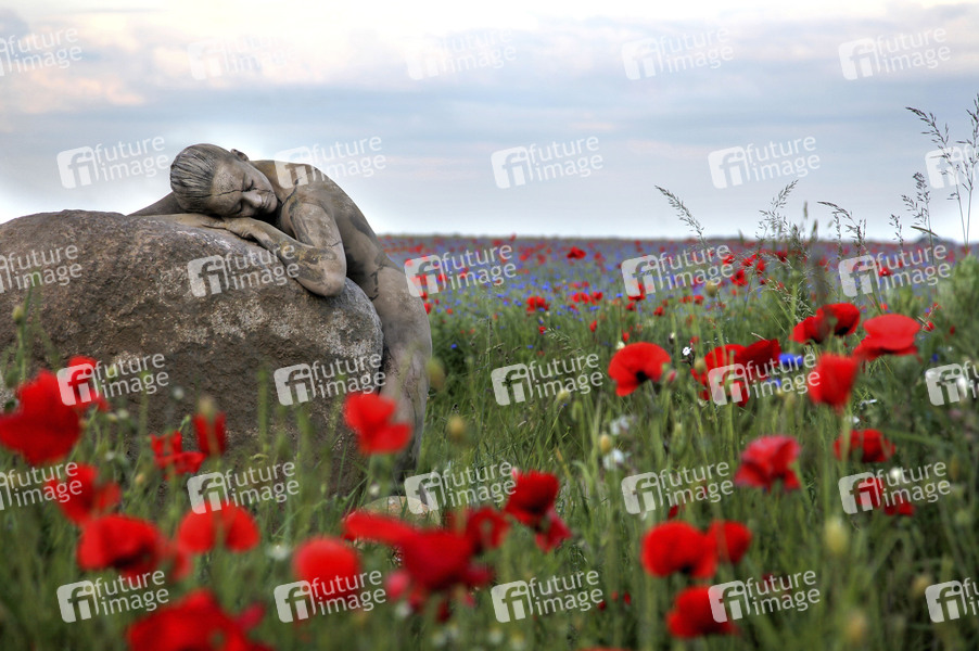 Welttag des Naturschutzes-Bodypainting - Der 28. Juli steht als Welttag des Naturschutzes im Zeichen des aktiven Erhalts unseres natürlichen Lebensraums und seiner Ressourcen. Hier ein Bild aus dem Kunstprojekt 'Nature Art' des Bodyart-Künstlers Jörg Düsterwald mit Model Lea als Stein in einem Mohnfeld in Wunstrof. (Symbolbild, Themenbild, Model Release)