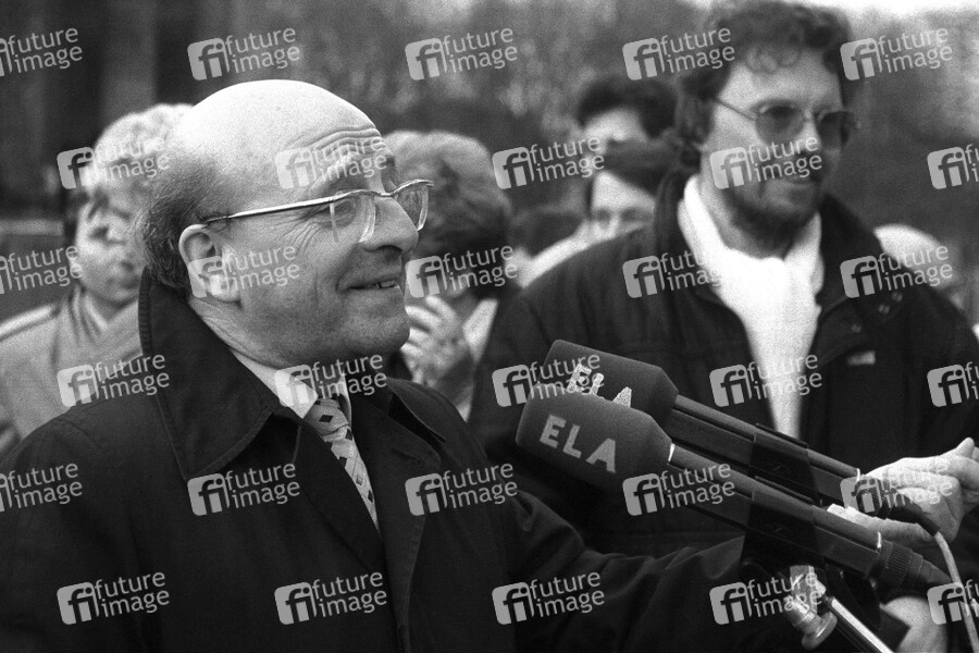 Wolfgang Ullmann spricht auf der Demonstration für einen Umtauschkurs von 1:1 bei der bevorstehenden Währungs- und Sozialunion. Berlin, 05.04.1990