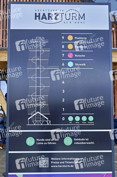 Der Harzturm ist ein 65 Meter hoher Aussichtsturm im Harz. Über eine Treppe oder einen Aufzug sind auf 45 Metern Turmhöhe zwei Panoramaplattformen, ein Skywalk mit gläsernem Boden und der Startpunkt einer 110 Meter langen Rutsche zu erreichen. Die hölzerne Turmschraube imitiert einen hohlen, drehwüchsigen Baumstamm. Dafür haben sich die österreichischen Planer, Architekt Dietmar Kaden und Tragwerksplaner Markus Lackner, das intelligente Naturdesign des aufgehenden Fichtenzapfens zum Vorbild genommen. Torfhaus, 25.02.2024