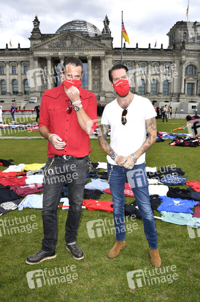 Sascha Vollmer und Alec Völkel von The BossHoss legen ihr letztes Hemd vor dem Reichstagsgebäude ab - Unter dem Motto #AlarmstufeRot protestieren Mitarbeiter der Kultur-und Veranstaltungsbranche in Berlin für Soforthilfen für die Veranstaltungswirtschaft. Durch die Schließungen und Absage von Veranstaltungen während der Corona-Pandemie stehen viele Kulturschaffende, Veranstalter, Messe- oder Bühnenbauer, Techniker und Kunstschaffende vor dem Aus. Berlin, 09.09.2020