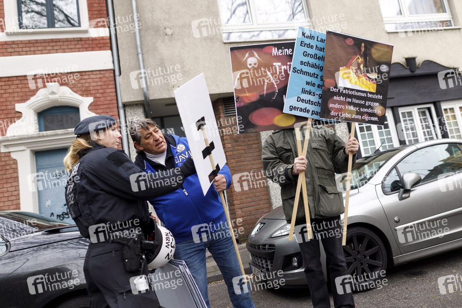 Theo Gottschalk (l.) und Demonstrant gegen den WDR bei den Protesten gegen das von einem Kinderchor gesungene Satire-Lied 'Meine Oma ist ne alte Umweltsau' von WDR2 am WDR Gebäude in der Breite Straße. Köln, 04.01.2020