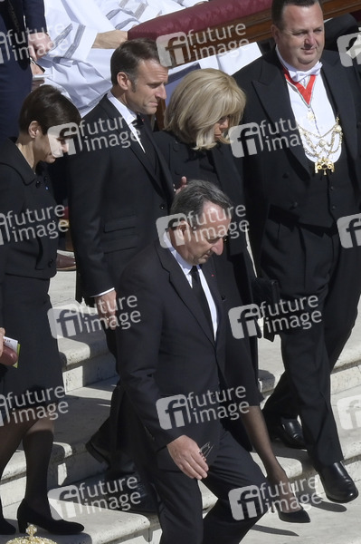 Emmanuel Macron mit Ehefrau Brigitte Macron bei der Trauermesse für den verstorbenen Papst Franziskus auf dem Petersplatz. Vatikanstadt, 26.04.2025