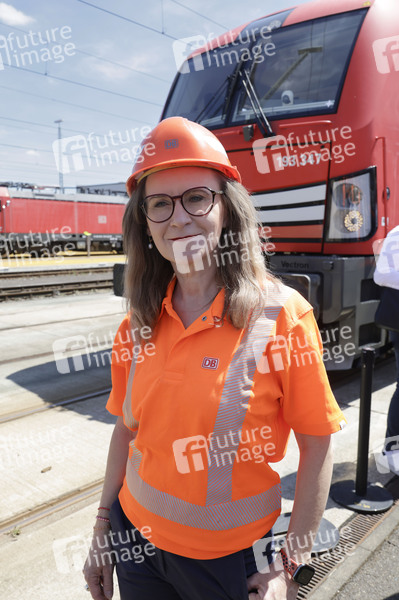 Sigrid Nikutta bei der Vorstellung der ersten Güterzuglokomotive, die für den automatisierten Streckenbetrieb umgerüstet wurde im DB Cargo-Werk Köln-Gremberg. Köln, 04.07.2025