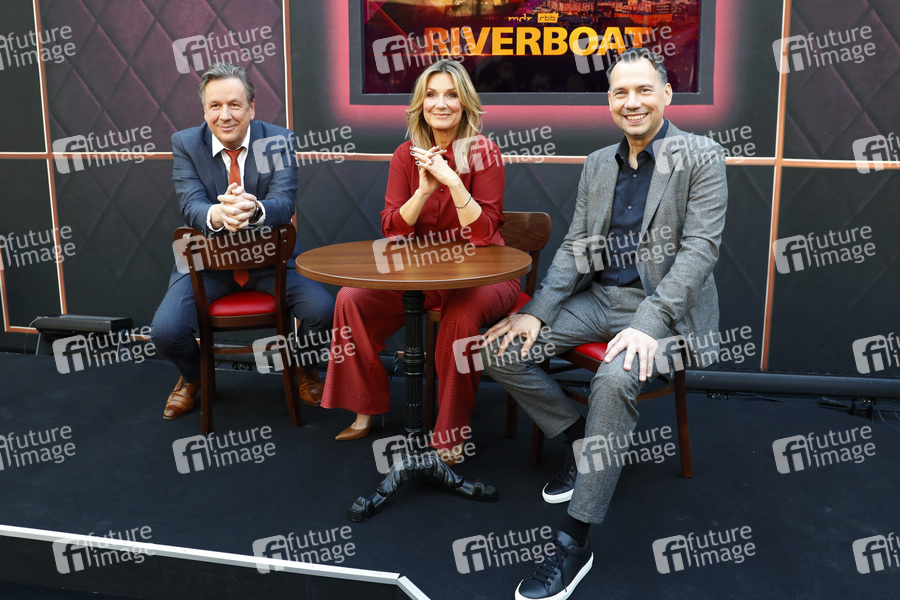 Jörg Kachelmann, Kim Fisher und Sebastian Fitzek beim Pressetermin zur MDR/rbb-Talkshow 'Riverboat' in der Riverboat-Kulisse im Mediengarten der Media City Leipzig. Leipzig, 08.10.2021