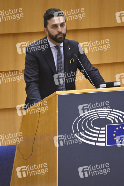 Marco Zanni bei der Debatte über die Aggression Russlands gegen die Ukraine im Plenarsaal des Europäischen Parlaments. Brüssel, 01.03.2022