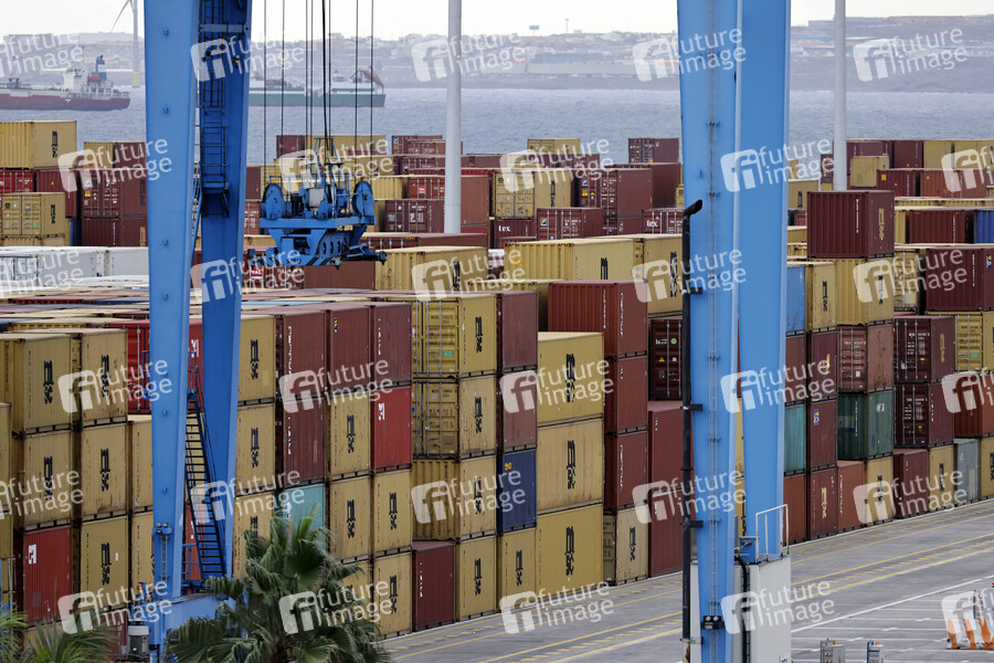 Container, Schiffscontainer, Ware, Waren, Bruttoregistertonne, Bruttoregistertonnen, Warenverkehr, Warenaustausch, Welthandel, Handel, Wirtschaft, Makroökonomie, Schiffsfracht, Fracht, löschen, Einfuhr, Ausfuhr, Import, Export, Zoll, Zölle, Strafzölle, Lieferkette, Lieferketten, Hafen, Handelsroute, Handelsrouten, Importe, Exporte, Exportüberschuss, Importüberschuss, Umschlagshafen, kanarische Inseln, Kanaren, Gran Canaria, ISO-Container, High Cube, Seecontainer, Logistik, Containerkrise, Transport, Transportkosten, globaler Markt, Weltwirtschaft, Hafen, Symbolbild, Symbolfoto