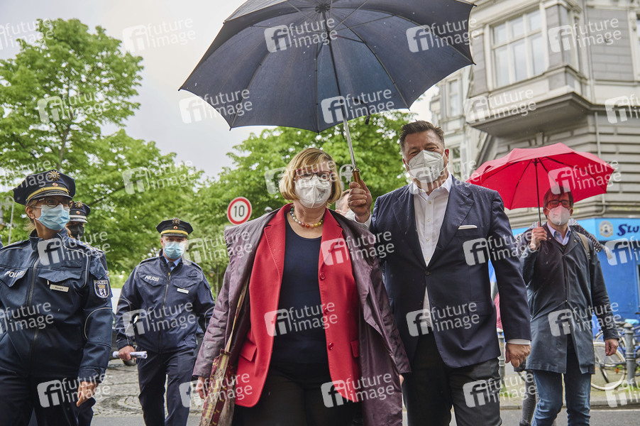 Angelika Schöttler und Andreas Geisel beim Besuch des Pilotprojekts 'Nachtlichter' und dem Team 'Nachtbürgermeister' zur Sicherheit und Gewaltprävention im Regenbogenkiez in Schöneberg. Berlin, 28.05.2021