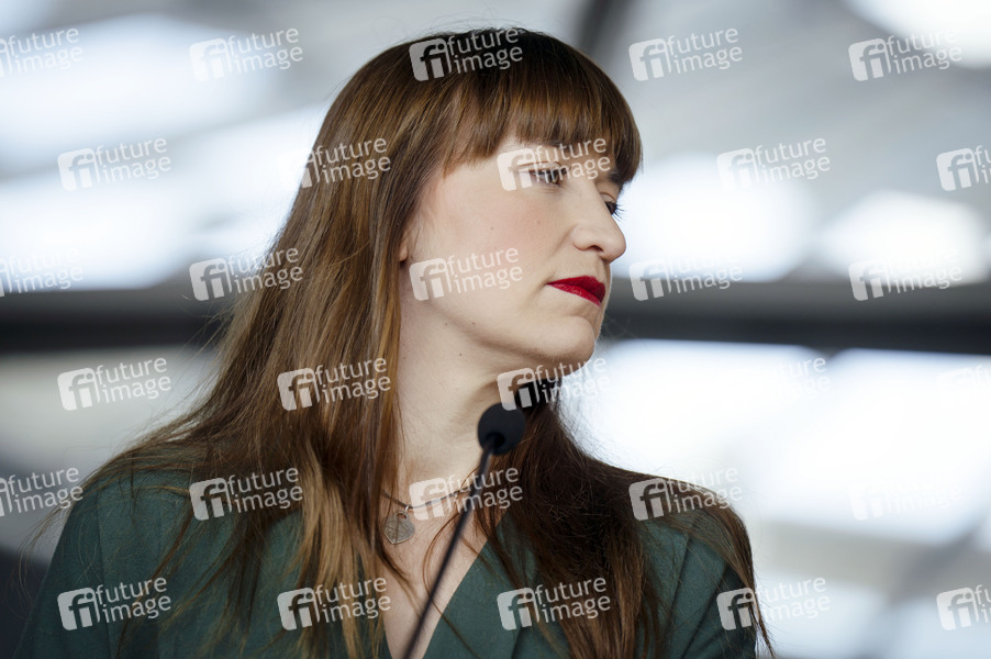 Heidi Reichinnek bei einem Pressestatement der Partei Die Linke im Reichstagsgebäude. Berlin, 20.05.2025