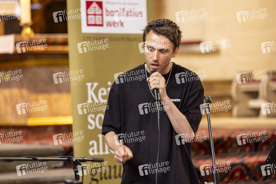 Clueso bei der Eröffnung der Ausstellung 'Udos 10 Gebote' mit 24 Gemälden zu den biblischen 10 Geboten von Udo Lindenberg in der Severikirche. Erfurt, 26.05.2024