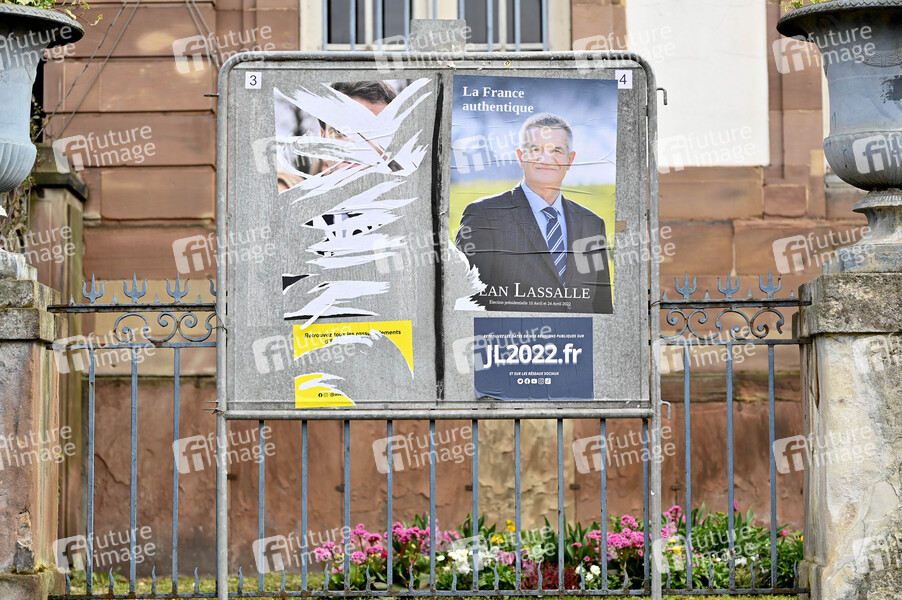Beschädigte Wahlplakate mit Emmanuel Macron (En Marche) und Jean Lassalle (Résistons) - Die Präsidentschaftswahl in Frankreich 2022 ist die zwölfte Wahl des Staatspräsidenten der Fünften Französischen Republik. Der erste Wahlgang findet nach Ablauf der laufenden fünfjährigen Amtszeit am 10. April 2022 statt. Sollte kein Kandidat im ersten Wahlgang die absolute Mehrheit er Stimmen erhalten, ist am 24. April ein zweiter Wahlgang vorgesehen. Straßburg, 05.04.2022