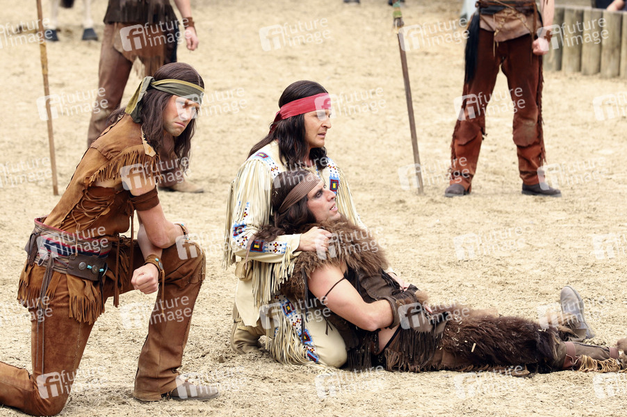 Jan Stapelfeldt, Alexander Klaws und Fabian Monasterios bei einer Aufführung von 'Der Ölprinz' bei den Karl-May-Festspielen 2022 im Freilichttheater am Kalkberg. Bad Segeberg, 06.08.2022