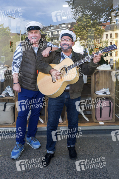 Klaus Baumgart und Claas Vogt von Klaus & Klaus beim Fototermin vor der Textildruckerei EINDRUCK, welche Mund-Nase-Masken mit dem echten Lächeln der Träger herstellt. Hamburg, 06.05.2020