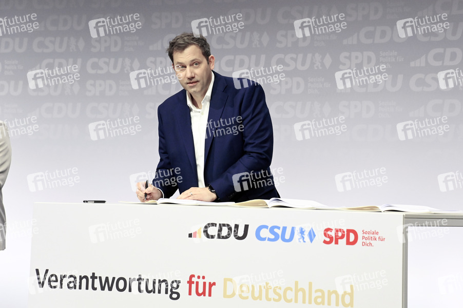 Lars Klingbeil bei der Unterzeichnung des Koalitionsvertrages zwischen CDU, CSU und SPD im Gasometer Schöneberg. Berlin, 05.05.2025