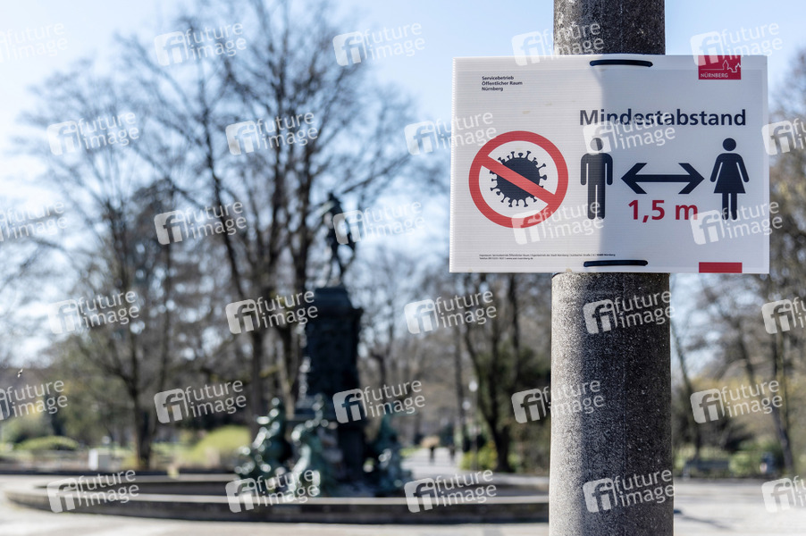 Hinweisschild zum Mindestabstand wegen der Coronakrise im Stadtpark. Nürnberg, 24.03.2020