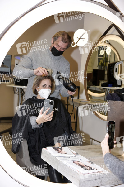 Sarah Valentina Winkhaus mit Friseur Dirk Eichfeld-Kilian beim Friseurbesuch nach dem Friseurneustart nach Lockdown im Salon Figaro. München, 10.03.2021