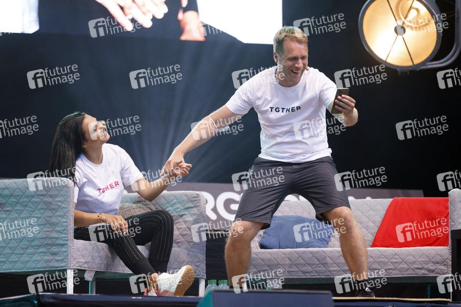 Oliver Pocher mit Ehefrau Amira Pocher mit dem Programm 'Die Pochers hier!' live im Kulturgarten in der Bonner Rheinaue. Das Bonn Live Kulturgarten Open Air Festival 2020 ist Europas erstes Open Air Festival unter Corona-Auflagen wegen der Covid-19 Pandemie. Bonn, 09.08.2020
