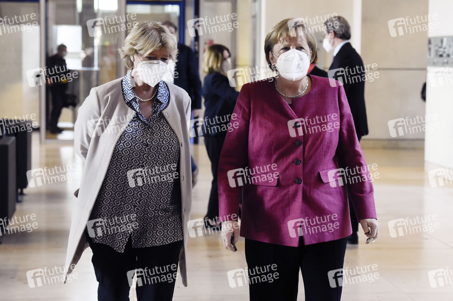 Monika Grütters und Angela Merkel in der 223. Sitzung des Deutschen Bundestages im Reichstagsgebäude. Berlin, 21.04.2021