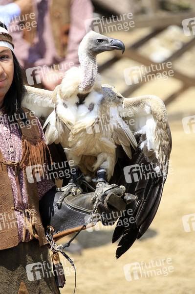 Der Geier beim Pressetermin der Karl-May-Spiele 2019 mit Szenen aus 'Unter Geiern - Der Sohn des Bärenjägers' im Freilichttheater am Kalkberg. Bad Segeberg, 21.06.2019