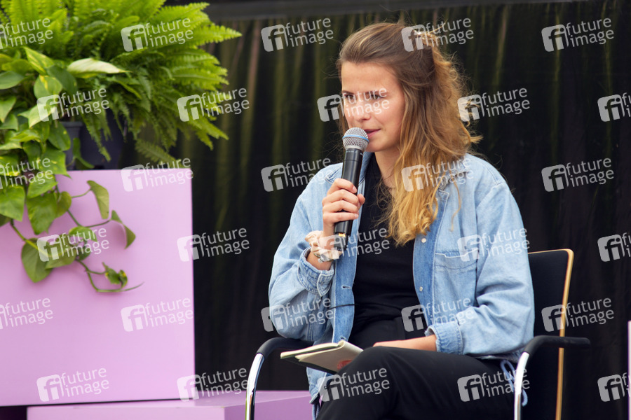 Luisa Neubauer bei der Buchvorstellung 'Noch haben wir die Wahl' im Rahmen des Kulturprojekts Wissensstadt Berlin 2021 am Platz vor dem Roten Rathaus vor. Berlin, 29.07.2021