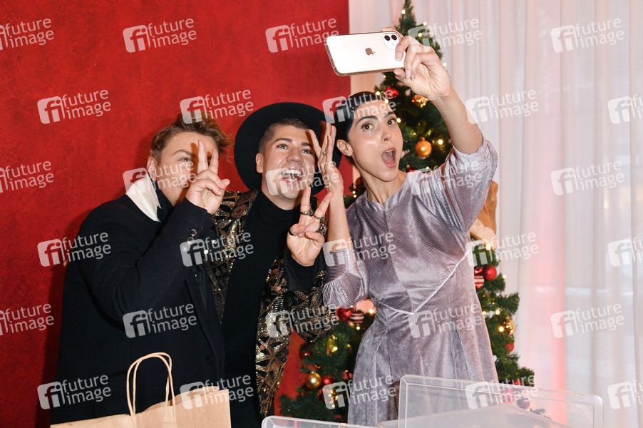 Dawid Tomaszewski, Maximilian Seitz und Zoe Helali bei der Veranstaltung 'Strassenfeger x Maximilian Seitz - Weihnachtsgeschenke einpacken für Obdachlose und Bedürftige' im Hotel Q!. Berlin, 08.12.2021