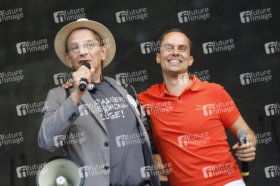 Bodo Schiffmann und Samuel Eckert - Demonstranten verschiedener Gruppierungen wie etwa der Initiative Querdenken 711 protestierten mit einer Großdemonstration in Berlin gegen die bestehenden Maßnahmen zur Eindämmung der Corona-Pandemie. Wegen Nichteinhaltung der polizeilichen Auflagen wurde die Demonstration durch die Polizei beendet. Es gab Rangeleien und Festnahmen. Berlin, 29.08.2020