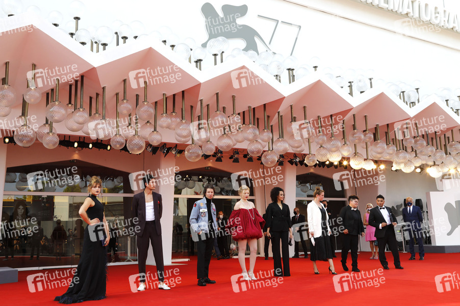 Mala Emde, Noah Saavedra, Tonio Schneider, Luisa-Celine Gaffron, Ivy Lissack, Julia von Heinz, Gast und Hussein Eliraqui bei der Premiere des Kinofilms 'Und morgen die ganze Welt / And Tomorrow the Entire World' auf der Biennale di Venezia 2020 / 77. Internationale Filmfestspiele von Venedig im Palazzo del Cinema. Venedig, 10.09.2020