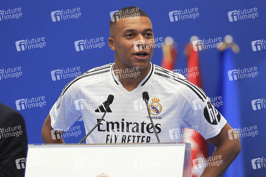 Kylian Mbappe bei der Präsentation als neuer Spieler von Real Madrid im Estadio Santiago Bernabéu. Madrid, 16.07.2024