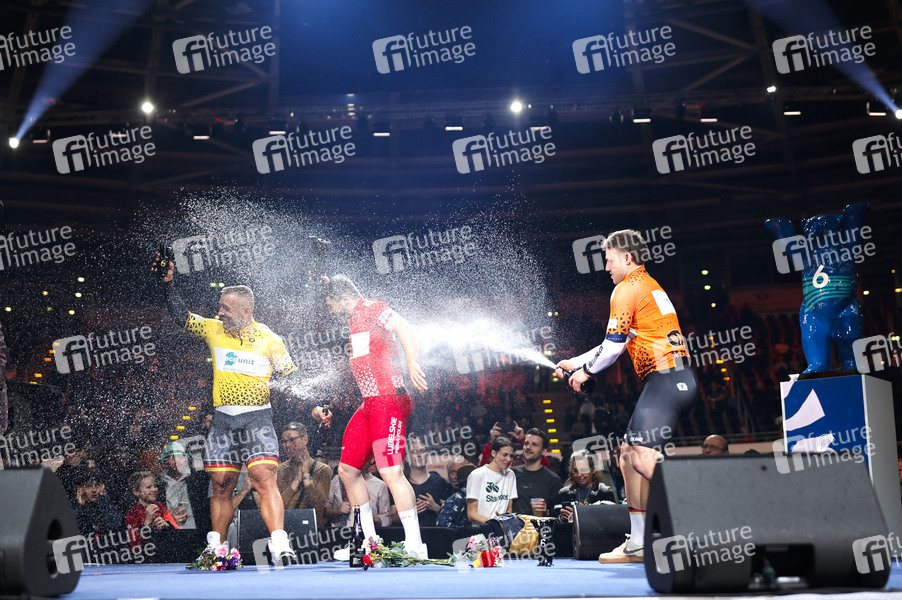 Mateusz Rudyk (POL), Maximilian Dörnbach (GER) und Robert Förstemann (GER) mit einer Champagnerdusche beim Sixdays Weekend 2025 im Velodrom. Berlin, 01.02.2025