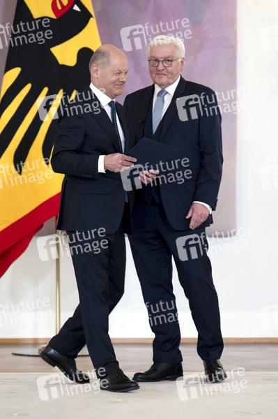 Olaf Scholz und Frank-Walter Steinmeier bei der Entlassung der Bundesregierung des 20. Deutschen Bundestages durch den Bundespräsidenten im Schloss Bellevue. Berlin, 25.03.2025