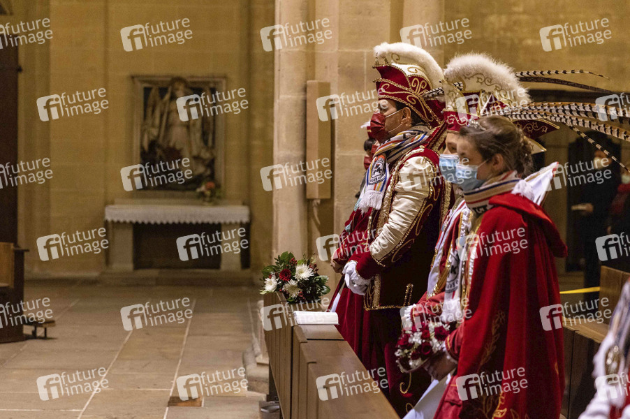 Der karnevalistische Gottesdienst fand unter 3G-Bestimmungen in der Severikirche auf dem Erfurter Domberg statt. Pfarrer Michael Neudert, gab den Karnevalisten, einschließlich den Prinzenpaaren Christian II. und Verena II. und den Kindern Luca I. und Noelanie I. den Segen für die anstehende Kampagne. (Personen im Bild: v.l. Prinzessin Verena II., Prinz Christian II., Kinderprinz Luca I. und Kinderprinzessin Noelani I.). Erfurt, 16.01.2022