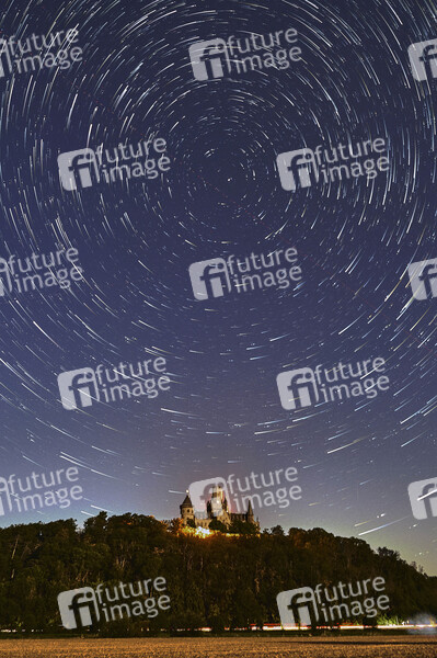Abendhimmel am Schloss Marienburg auf dem Marienberg (Eine schriftliche Freigabe der Luftbilder durch die Pressesprecherin Annette Langhorst liegt vor). Der Startrail-Effekt entstand durch Langzeit- und Mehrfachbelichtung und zeigt die Sternenspuren duch die Erdrotation. Nordstemmen, 13.08.2022