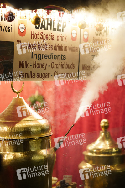 Verkaufsstand mit heiß dampfendem Teekessel auf dem 39. Weihnachtsmarkt an der Gedächtniskirche am Breitscheidplatz. Berlin, 07.12.2022
