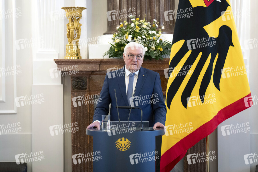 Frank-Walter Steinmeier bei der Übergabe der Wohlfahrtsmarken 2025 durch den Bundesminister der Finanzen an den Bundespräsidenten im Schloss Bellevue. Berlin, 21.02.2025
