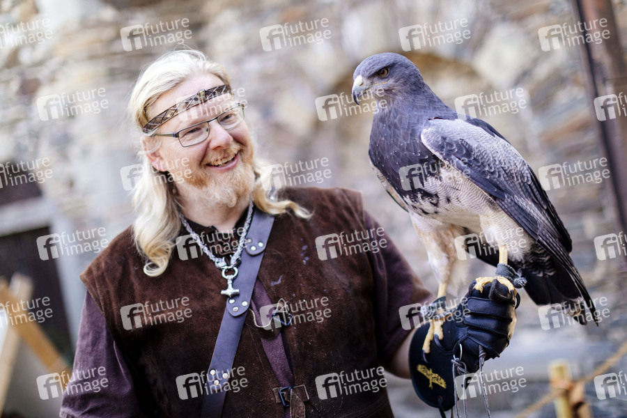 Ein Falkner auf der 1. German Castle Con auf Schloss Burg an der Wupper. Solingen, 24.08.2019