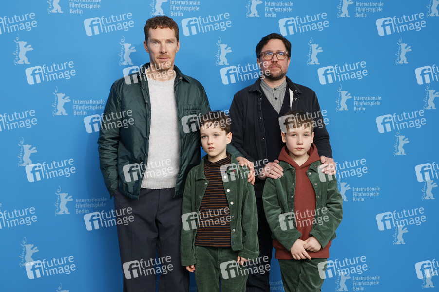 Benedict Cumberbatch, Richard Boxall, Dylan Southern und Henry Boxall beim Photocall zum Kinofilm 'The Thing with Feathers' auf der Berlinale 2025 / 75. Internationale Filmfestspiele Berlin im Hotel Grand Hyatt. Berlin, 18.02.2025