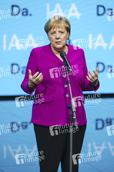 Angela Merkel beim Abschlussstatement am Messestand von BMW beim Eröffnungsrundgang auf der Internationalen Automobil-Ausstellung 2019 auf dem Messegelände. Frankfurt am Main, 12.09.2019