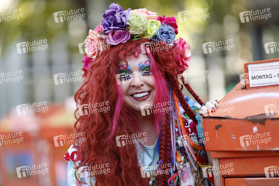 Elke Koska, ehemalige Muse von HA Schult, bei der Präsentation seiner Installation 'Tableau des Vergessens' aus alten Bild-Verkaufskästen auf dem Börsenplatz. Köln, 10.09.2020