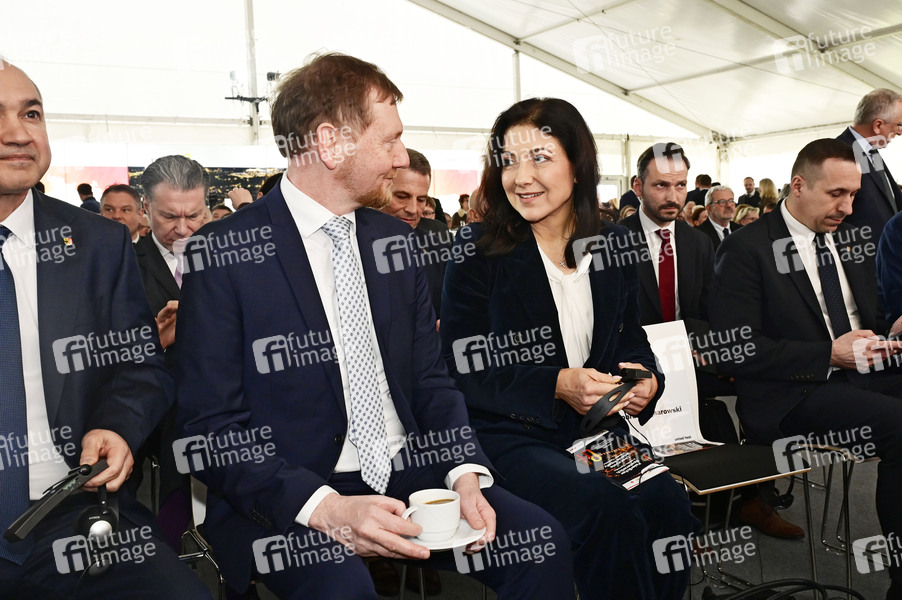 Michael Kretschmer und Katherina Reiche beim feierlichen Spatenstich des Projekts 'United Heat' - Klimaneutrale Fernwärme für die Europastadt Görlitz–Zgorzelec an der Kläranlage Görlitz Nord. Görlitz, 31.03.2026