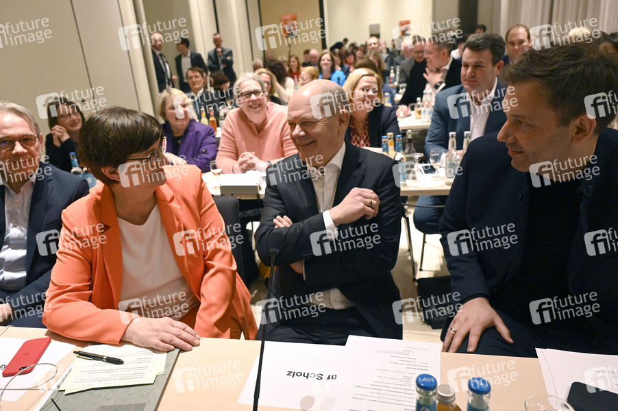 Saskia Esken, Olaf Scholz und Lars Klingbeil bei Beratungen im Rahmen einer Klausur des SPD-Parteivorstandes in der Landesvertretung Hamburg beim Bund. Berlin, 15.03.2024