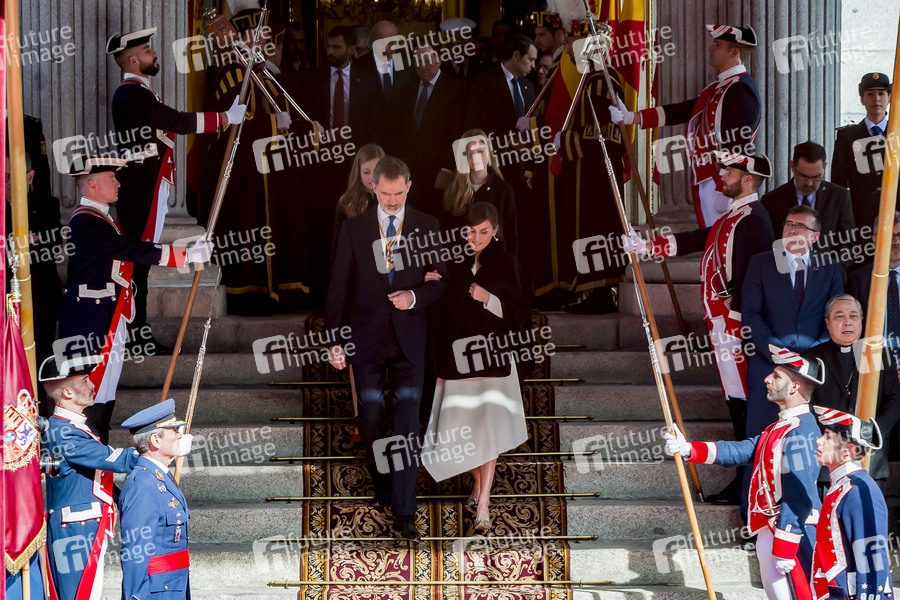 Prinzessin Sofia von Spanien, König Felipe VI. von Spanien, Königin Letizia von Spanien und Prinzessin Leonor von Spanien bei der feierlichen Eröffnung der XIV. Legislatur des Congreso de los Diputados, des Unterhauses des spanischen Parlamentes, vor dem Palacio de las Cortes. Madrid, 03.02.2020