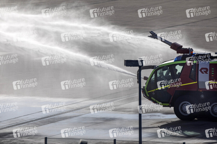 Großflughafenlöschfahrzeug Panther bei der Notfallübung der Werkfeuerwehr, der Feuerwehr Köln und den Hilfsorganisationen am Flughafen Köln/Bonn. Im Rahmen der Übung wird die Kollision eines Flugzeugs mit einem Passagierbus und einer Abfertigungshalle simuliert. Einsatzkräfte retten aus dem in Brand geratenen Flugzeug und dem Gebäude Personen und versorgten diese. Köln, 06.11.2021