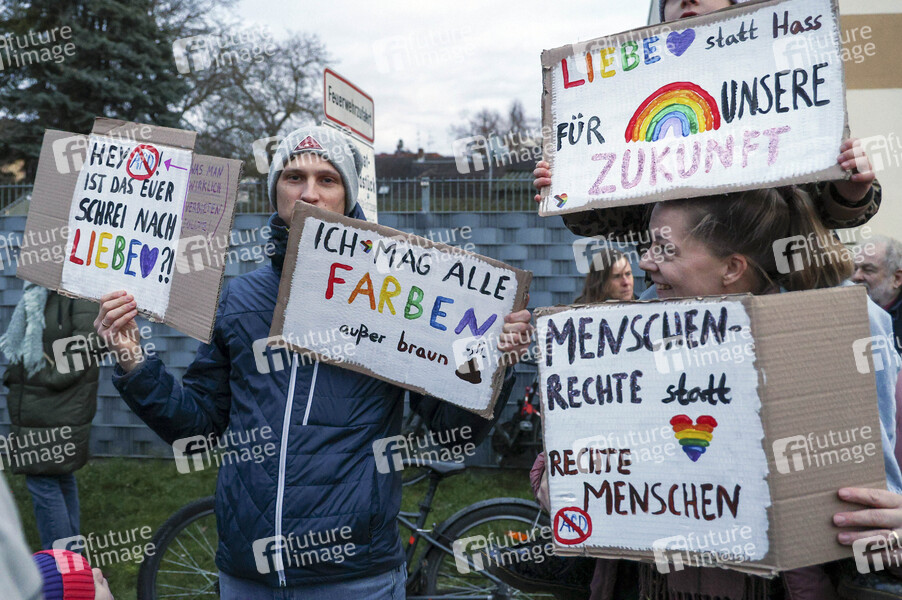Demo vor der Stadthalle Falkensee. In einem Antrag forderte die AfD Falkensee ein Verbot für das Hissen der Regenbogenflagge an öffentlichen Plätzen und Gebäuden der Stadt. Ein breites Bündnis aus Vereinen, Jugendgruppen, Kirchenvertretern und Initiativen reagierte darauf mit Widerstand. Mit deutlicher Mehrheit haben die Stadtverordneten den Antrag der AfD abgelehnt. Falkensee, 29.01.2025