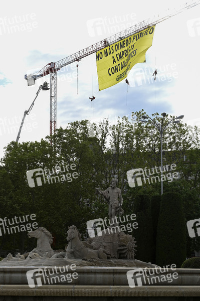 Greenpeace-Aktivisten montieren ein Banner an einen Baukran um gegen die Unterstützung der Regierung für umweltverschmutzende Unternehmen zu protestieren. Madrid, 16.06.2020