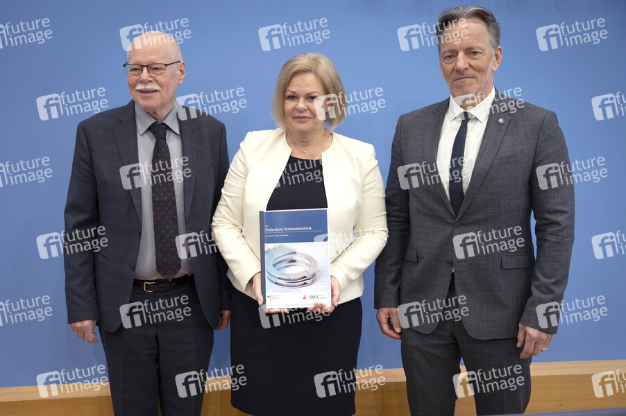 Holger Münch, Nancy Faeser und Holger Münch bei der Bundespressekonferenz zur Vorstellung der Polizeilichen Kriminalstatistik 2024 im Haus der Bundespressekonferenz. Berlin, 02.04.2025