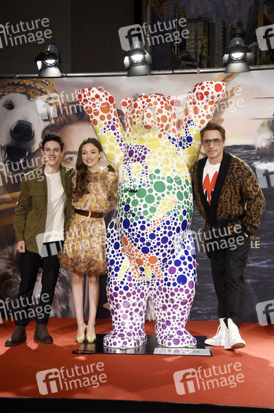 Harry Collet, Carmel Laniado und Robert Downey Jr. beim Signieren eines Buddy Bären während der Pressekonferenz zum Kinofilm 'Die fantastische Reise des Dr. Dolittle' im Waldorf Astoria Hotel. Berlin, 20.01.2020