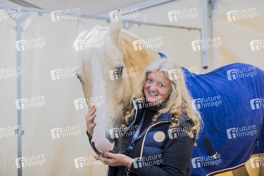 Tierschutzbeauftragte Anita Förster bei der Backstageführung zur Pferdeshow 'Cavalluna - Grand Moments' mit Reitkunst, Aktobatik und Tanz in der Messehalle. Erfurt, 25.04.2025