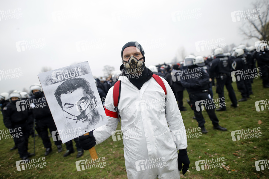 Ein Demonstrant posiert mit einem im Stile Adolf Hitler verfremdeten Konterfei von Markus Söder, betitelt als 'Södolf', auf der Querdenken-Demo im Rheinpark Golzheim. Düsseldorf, 06.12.2020